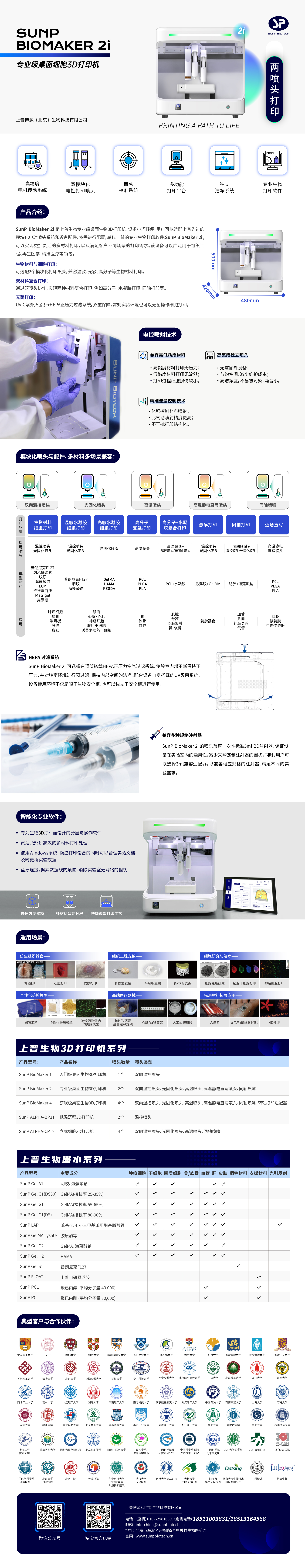 SunP BioMaker 2i 是上普生物專業級雙噴頭桌面級生物3D打印機,通過搭載2個模塊化打印噴頭,無論是水凝膠細胞打印、高分子支架打印還是雙材料復合打印,都可以輕松勝任。