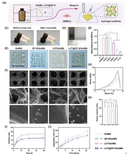 LUT@ZIF-8/GelMA生物墨水的制備流程如下:首先將50 mg苯基-2,4,6-三甲基苯甲酰基次膦酸鋰(EFL,中國)溶于10 mL PBS溶液,45℃間歇攪拌15 min。隨后將500 mg GelMA(EFL,中國)加入5 mL LAP溶液中,65℃避光加熱15 min。滅菌后,將LUT@ZIF-8納米顆粒懸液按1:1(v/v)與GelMA溶液混合,超聲處理5 min形成均質(zhì)生物墨水。使用23G針頭的5 mL注射器裝載生物墨水,置于3D生物打印機(jī)BM2i(Sunp,中國)中,設(shè)置打印頭與平臺溫度分別為18-22℃和18℃,打印速度與擠出速度分別為5 mm/min和2 mm/min。405 nm波長紫外光(0.5 W/cm2)固化成型。封裝rBMSCs時,將細(xì)胞以1.5×10?cells/mL密度混懸于生物墨水中進(jìn)行打印。