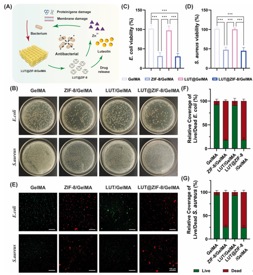 針對骨缺損常見感染風(fēng)險,評估水凝膠支架對大腸桿菌和金黃色葡萄球菌的抑制作用(圖4A)。菌落計數(shù)顯示,LUT@ZIF-8/GelMA與ZIF-8/GelMA組顯著降低菌落數(shù)量(圖4B),24小時后細(xì)菌存活率分別下降至23.5%和28.7%(圖4C-D)。活/死菌染色顯示,含ZIF-8組紅色熒光比例顯著增加(圖4E-G),證實其強(qiáng)效抗菌作用。抗菌機(jī)制歸因于Zn2?破壞細(xì)菌細(xì)胞膜,以及木犀草素抑制DNA拓?fù)洚悩?gòu)酶的雙重協(xié)同效應(yīng)。LUT/GelMA組因藥物濃度不足僅表現(xiàn)微弱抗菌活性。