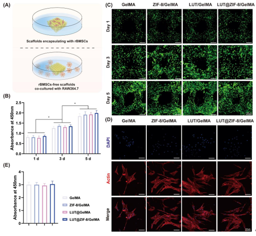 通過生物打印構(gòu)建載有大鼠骨髓間充質(zhì)干細(xì)胞(rBMSCs)的支架評估其細(xì)胞封裝性能,同時制備空白水凝膠支架研究其對巨噬細(xì)胞增殖的影響(圖5A)。CCK-8檢測顯示各組細(xì)胞增殖隨時間顯著增強(qiáng),活/死染色證實細(xì)胞均勻分布且存活良好(圖5B-C)。第5天TRITC-鬼筆環(huán)肽染色顯示LUT@ZIF-8/GelMA組細(xì)胞伸展更顯著,表明其更優(yōu)的細(xì)胞擴(kuò)展性能(圖5D)。第7天所有組別均呈現(xiàn)良好細(xì)胞延展,證實水凝膠基質(zhì)成功模擬細(xì)胞外基質(zhì)特性。RAW264.7細(xì)胞實驗表明各組支架3天內(nèi)均無細(xì)胞毒性(圖5E)。結(jié)果表明,LUT@ZIF-8納米顆粒在適宜濃度下保持良好生物相容性,生物打印支架既能支持rBMSCs增殖擴(kuò)展,又不影響巨噬細(xì)胞正常增殖。