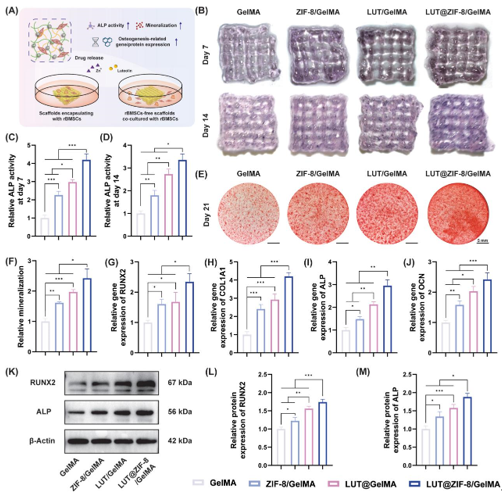 骨髓間充質(zhì)干細(xì)胞(BMSCs)是骨組織工程的核心種子細(xì)胞,既能直接成骨分化,又能通過旁分泌促進(jìn)組織修復(fù)。針對骨缺損區(qū)干細(xì)胞不足的問題,負(fù)載rBMSCs的支架可顯著提升骨再生效果。本研究通過ALP染色、茜素紅(ARS)染色及基因蛋白檢測評估水凝膠支架成骨性能(圖6A)。結(jié)果顯示,LUT@ZIF-8/GelMA組ALP活性顯著高于對照組(圖6B-D),礦化結(jié)節(jié)密度與成骨基因(RUNX2/COL1A1/ALP/OCN)表達(dá)均最優(yōu)(圖6E-J),Western blot證實其RUNX2和ALP蛋白表達(dá)最高(圖6K-M)。機(jī)制上,水凝膠內(nèi)ZIF-8納米顆粒緩釋Zn2?維持最佳濃度,與木犀草素協(xié)同增強(qiáng)成骨效應(yīng)。木犀草素通過Wnt通路促進(jìn)成骨細(xì)胞礦化,而適量Zn2?可經(jīng)TGF-β/PI3K-AKT通路激活BMSCs成骨分化。該研究證實LUT@ZIF-8/GelMA支架通過雙因子控釋體系有效促進(jìn)骨再生。