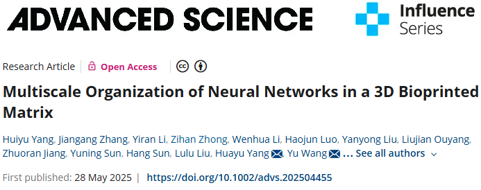 H. Yang, J. Zhang, Y. Li, Z. Zhong, W. Li, H. Luo, Y. Liu, L. Ouyang, Z. Jiang, Y. Sun, H. Sun, L. Liu, H. Yang, Y. Wang, N. Yang, W. Ma, Y. Mao, Multiscale Organization of Neural Networks in a 3D Bioprinted Matrix. Adv. Sci. 2025, e04455.