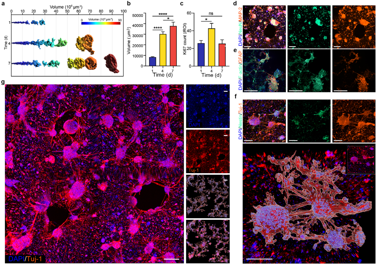 2、3D neuMatrix 中的多尺度神經(jīng)網(wǎng)絡(luò)體外培養(yǎng)期間,細(xì)胞簇體積顯著增長(zhǎng),前3天擴(kuò)大3倍(8408 μm3增至30215 μm3)(圖2a,b)。Ki67陽(yáng)性細(xì)胞數(shù)在DIV4達(dá)峰(42.8±5.6個(gè)/ROI),DIV7降至25.5±4.3個(gè)/ROI,與體積增長(zhǎng)和整體活力趨勢(shì)一致(圖2c)。細(xì)胞簇主要由成熟的NeuN陽(yáng)性神經(jīng)元組成,富含MAP2陽(yáng)性突起和深染的SYN(表明豐富突觸)。Nestin陽(yáng)性干細(xì)胞極少。盡管未主動(dòng)篩選,GFAP陽(yáng)性星形膠質(zhì)細(xì)胞數(shù)量少于神經(jīng)元,并在神經(jīng)簇內(nèi)形成沿神經(jīng)突起延伸的支架樣結(jié)構(gòu)(圖2d,e)。Imaris重建顯示,局部尺度上相鄰簇間存在復(fù)雜多分支神經(jīng)突起網(wǎng)絡(luò)(圖2f)。毫米尺度上,整個(gè)3D neuMatrix形成了高度類(lèi)似體內(nèi)大腦樞紐和投射結(jié)構(gòu)的三維神經(jīng)網(wǎng)(圖2g)。