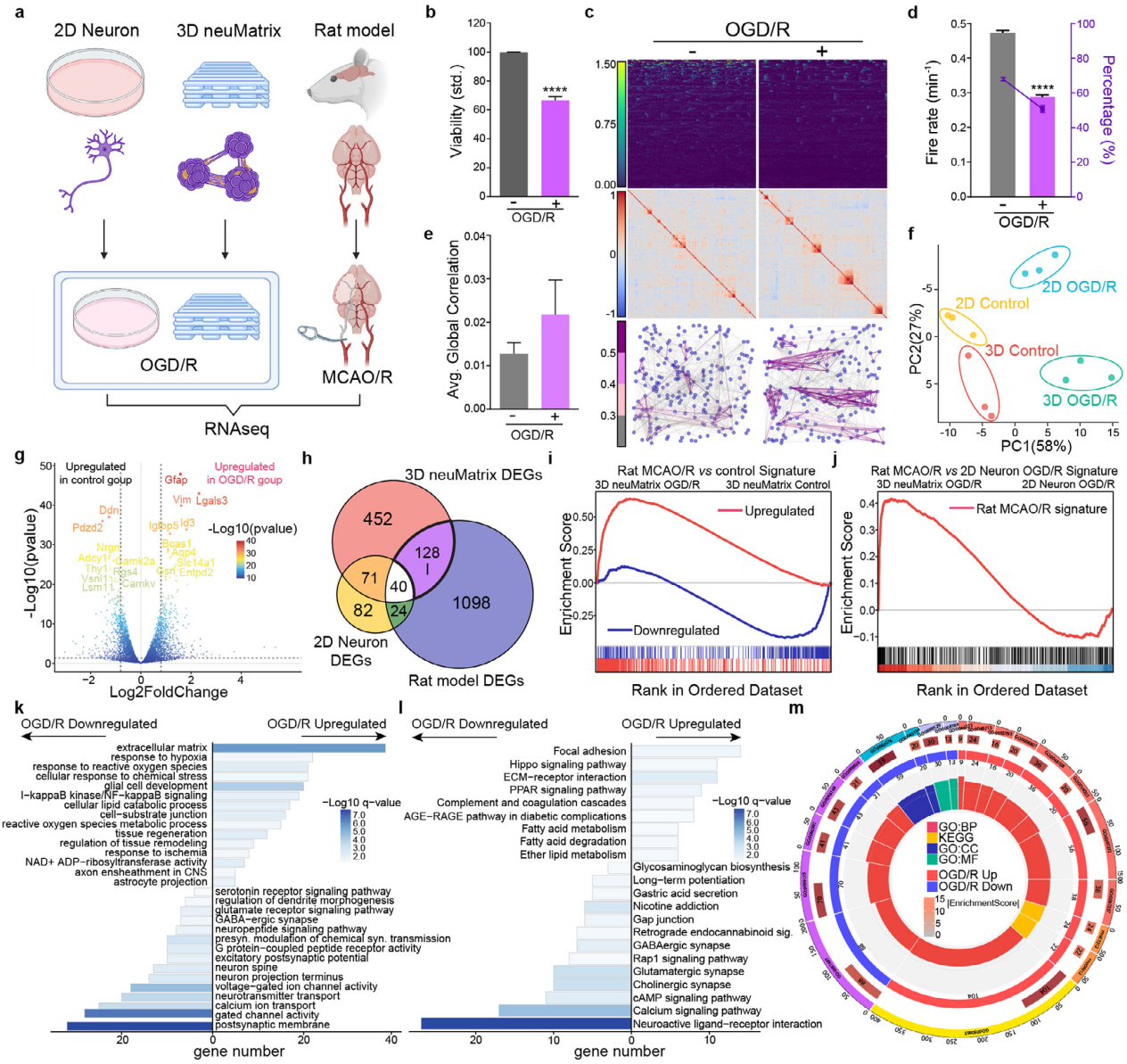 為評(píng)估3D neuMatrix在疾病建模與藥物篩選中的潛力,以缺血性中風(fēng)為模型,通過(guò)氧-葡萄糖剝奪/再灌注(OGD/R)處理發(fā)現(xiàn),OGD 4小時(shí)后細(xì)胞活力降至49.0±0.6%,鈣振蕩的放電速率和放電細(xì)胞百分比顯著降低,全局相關(guān)性呈上升趨勢(shì)(圖 6a-e)。轉(zhuǎn)錄組分析顯示,3D neuMatrix的OGD/R模型與大鼠MCAO/R模型的轉(zhuǎn)錄特征更吻合,其上調(diào)的缺氧響應(yīng)、ECM相互作用等通路,較2D培養(yǎng)更準(zhǔn)確模擬了缺血性中風(fēng)的神經(jīng)組織損傷機(jī)制(圖6f-m)。藥物篩選實(shí)驗(yàn)中,依達(dá)拉奉和丁苯酞未能改善OGD/R后的細(xì)胞活力與功能,可能因4小時(shí) OGD已造成不可逆損傷。綜上,3D neuMatrix在神經(jīng)疾病建模和藥物研發(fā)中展現(xiàn)出獨(dú)特優(yōu)勢(shì),為體外研究提供了更貼近體內(nèi)環(huán)境的平臺(tái)。