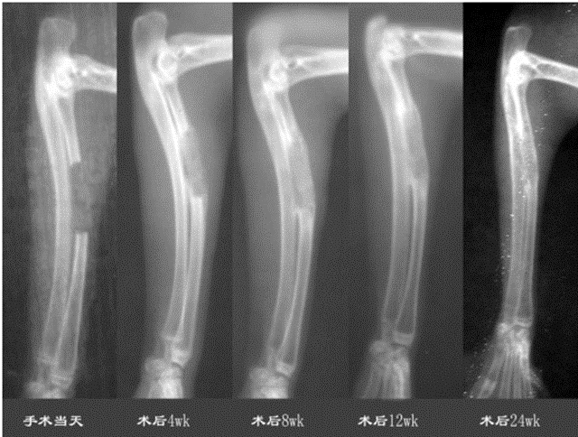 清華大學熊卓和第四軍醫大學利用PLLA/TCP復合材料,PLLA與TCP的質量比為7:3,制造支架的開放孔隙的孔隙率為80%,大孔孔徑約為500 μm,微孔孔徑約為5 μm。支架的外形為直徑5mm、長15mm的圓柱形;生長因子為rhBMP-2。結果顯示術后4周,骨缺損區有不均勻的低密度骨痂顯影;術后8周,骨痂顯影密度增高,骨痂外層形成皮質骨輪廓,與缺損斷端連接;術后12周,骨痂密度進一步增高,中心區出現與植入支架輪廓一致的高密度區,周圍皮質骨輪廓清晰,與斷端連接良好;術后24周,骨痂塑型完好,骨痂皮質骨與缺損兩斷端的皮質骨完全融合成一體,骨痂中心區密度降低。