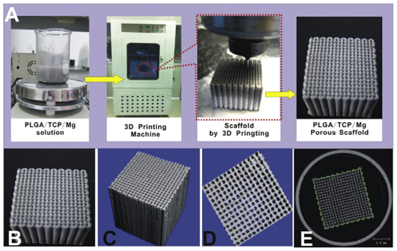 賴博士等 利用低溫沉積3D打印出PLGA/TCP/Mg體系的支架,宏觀空隙有450μm,微觀空隙在2.5-90μm之間,Mg的加入可以極大提高支架的力學性能,15%wt的Mg其力學強度可以達到104Mpa,而且保證良好的生物學性能可以促進并誘導細胞增殖分化成骨組織。